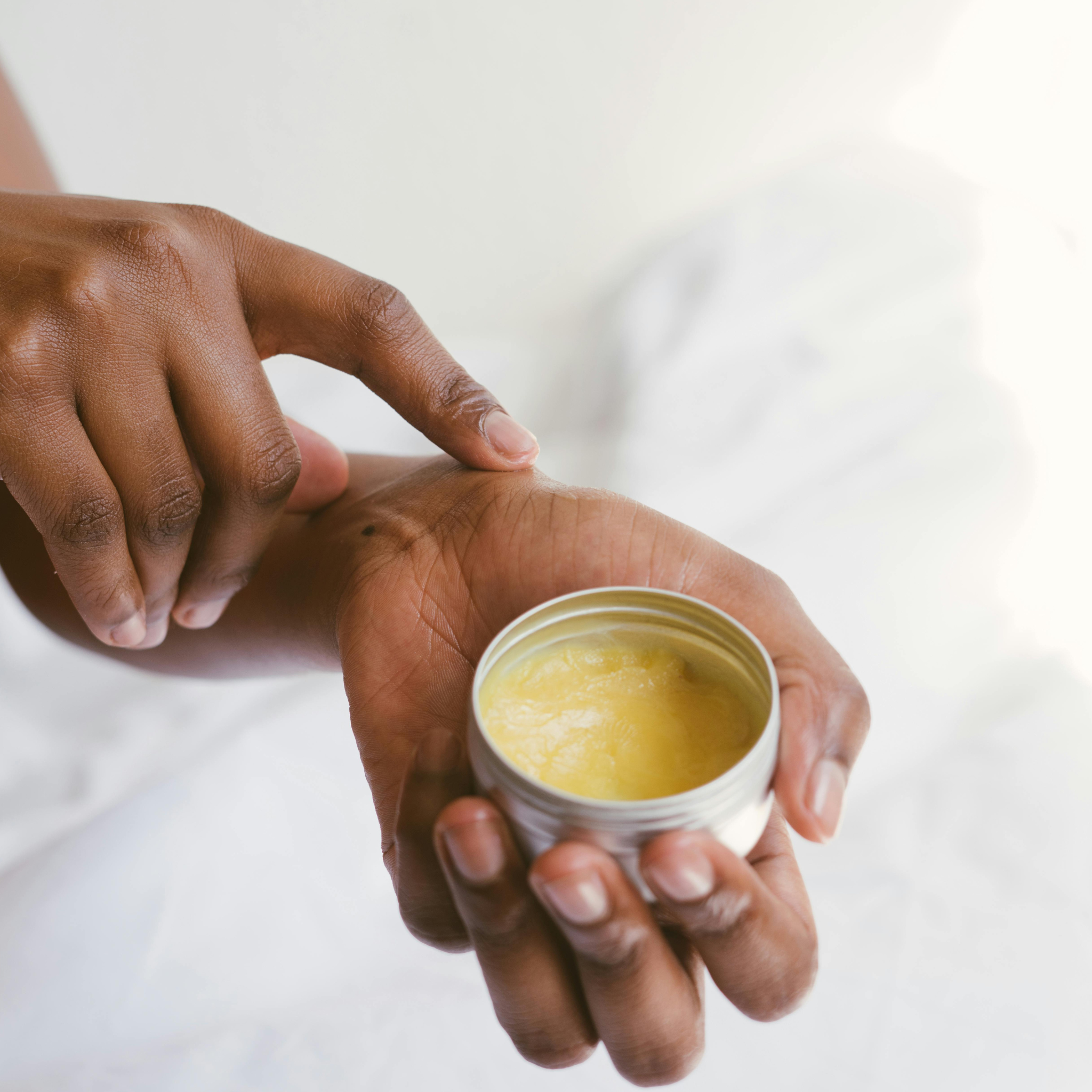 - Prélevez une petite noisette de beurre de mangue et faites-la fondre dans vos mains.